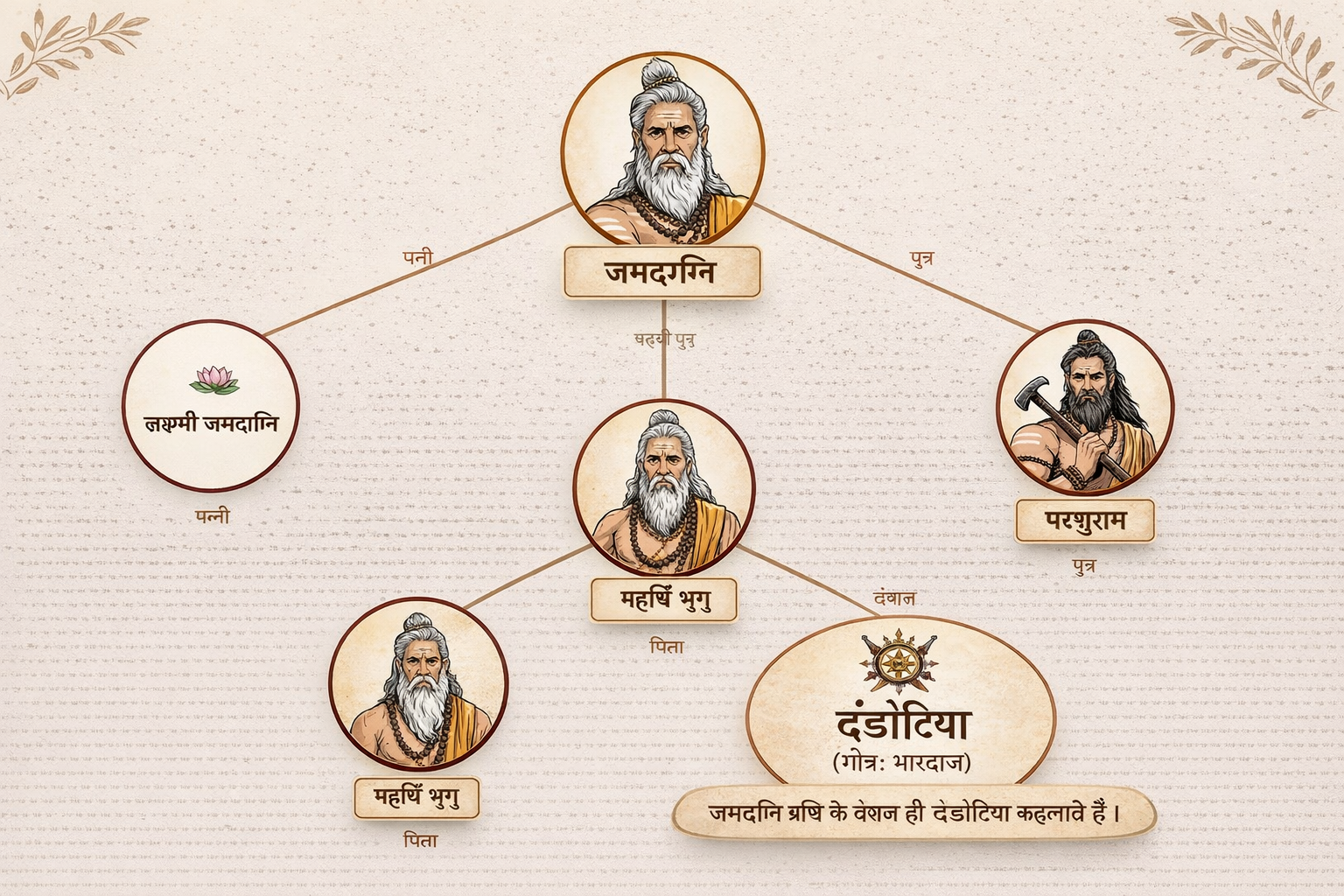 दंडोतिया परिवार की अटूट पितृ-परंपरा इसी भृगु तक जाती है — वही भृगु जिन्होंने वैदिक विधि की नींव रखी, लक्ष्मी को जन्म दिया, और जिनके वंश में परशुराम हुए। प्रत्येक दंडोतिया यह ब्रह्मांडीय वंशावली लिए चलता है।
